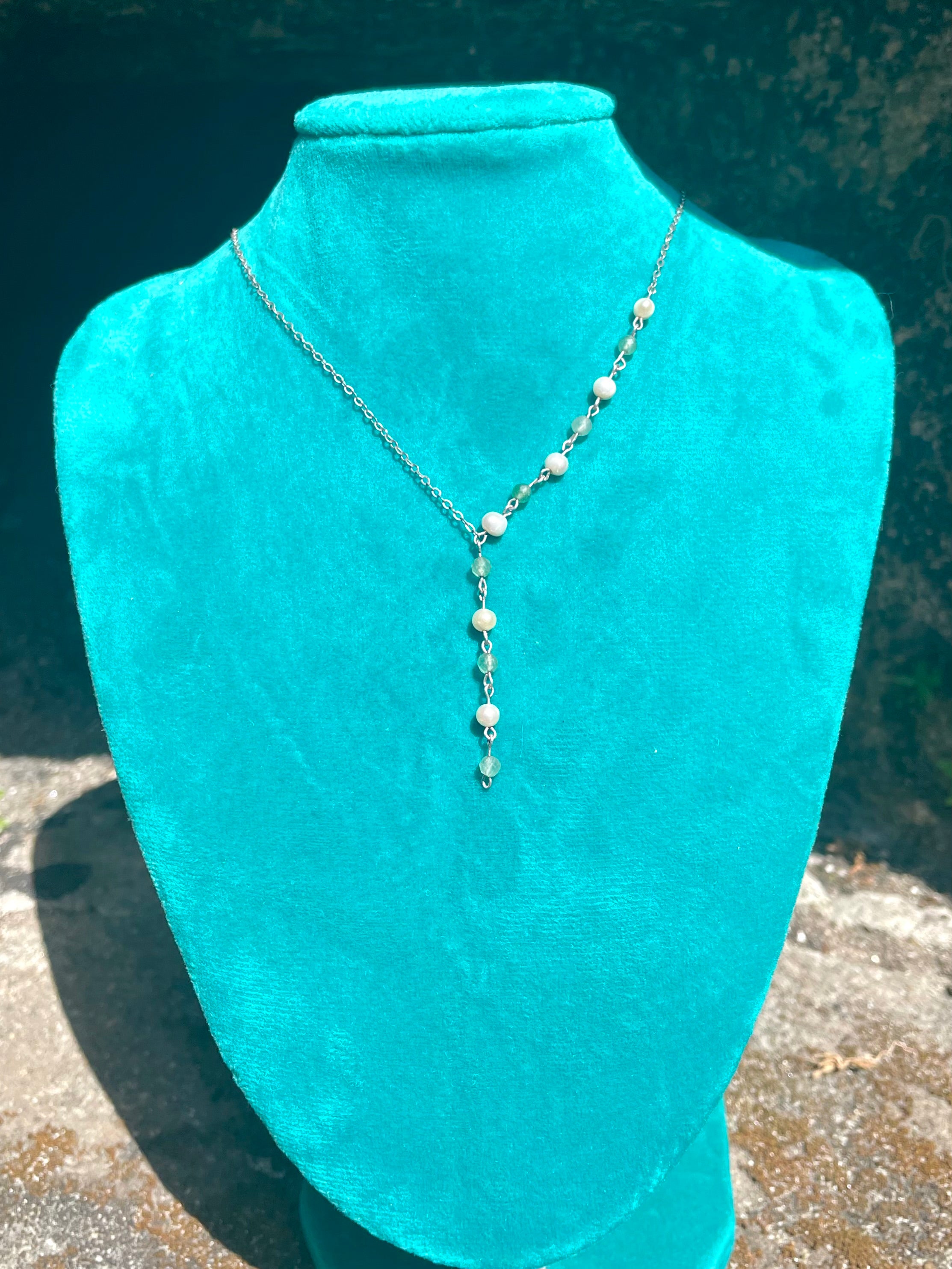 This style in particular features round pearls and Jade beads on a drop silver chain.
