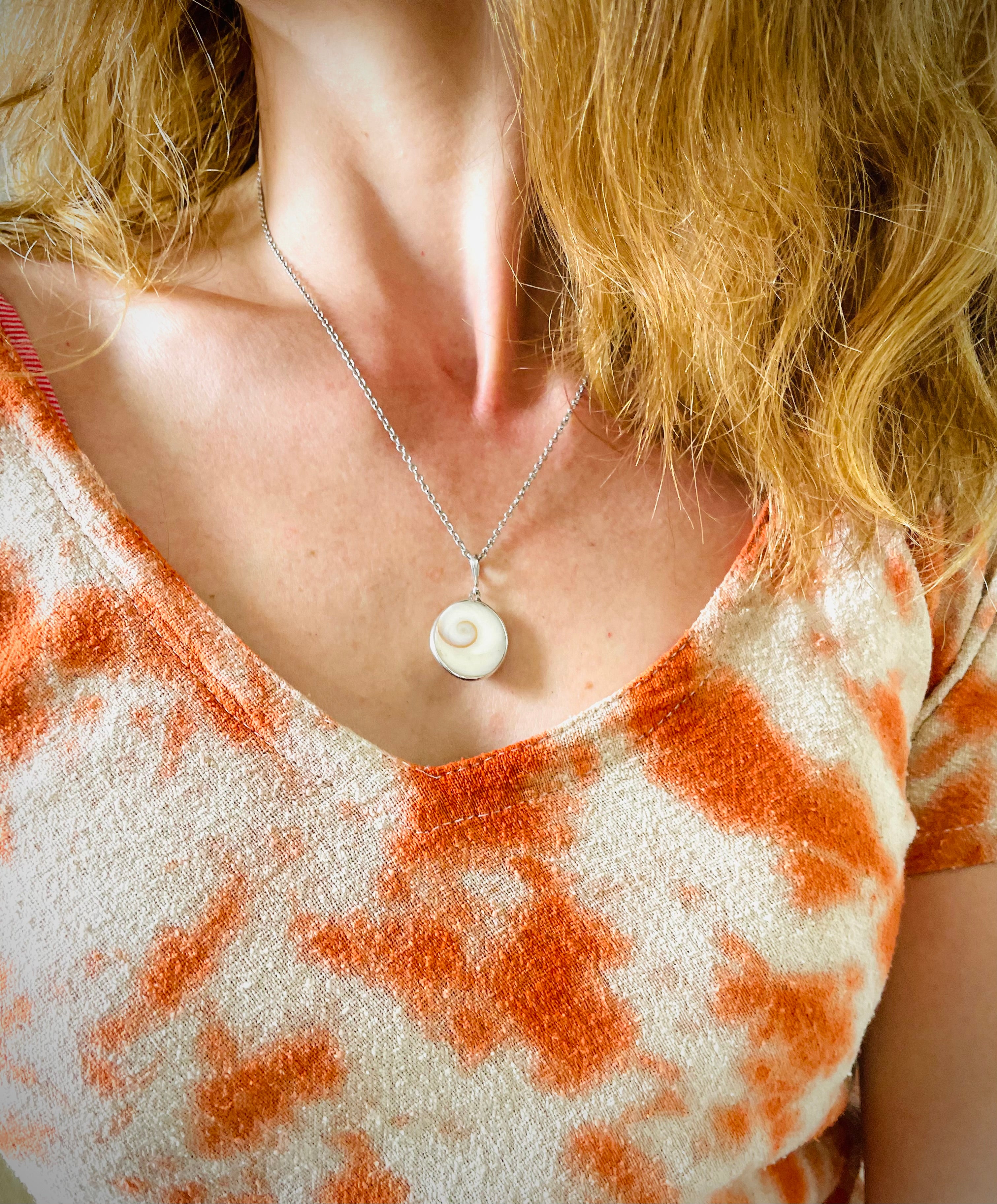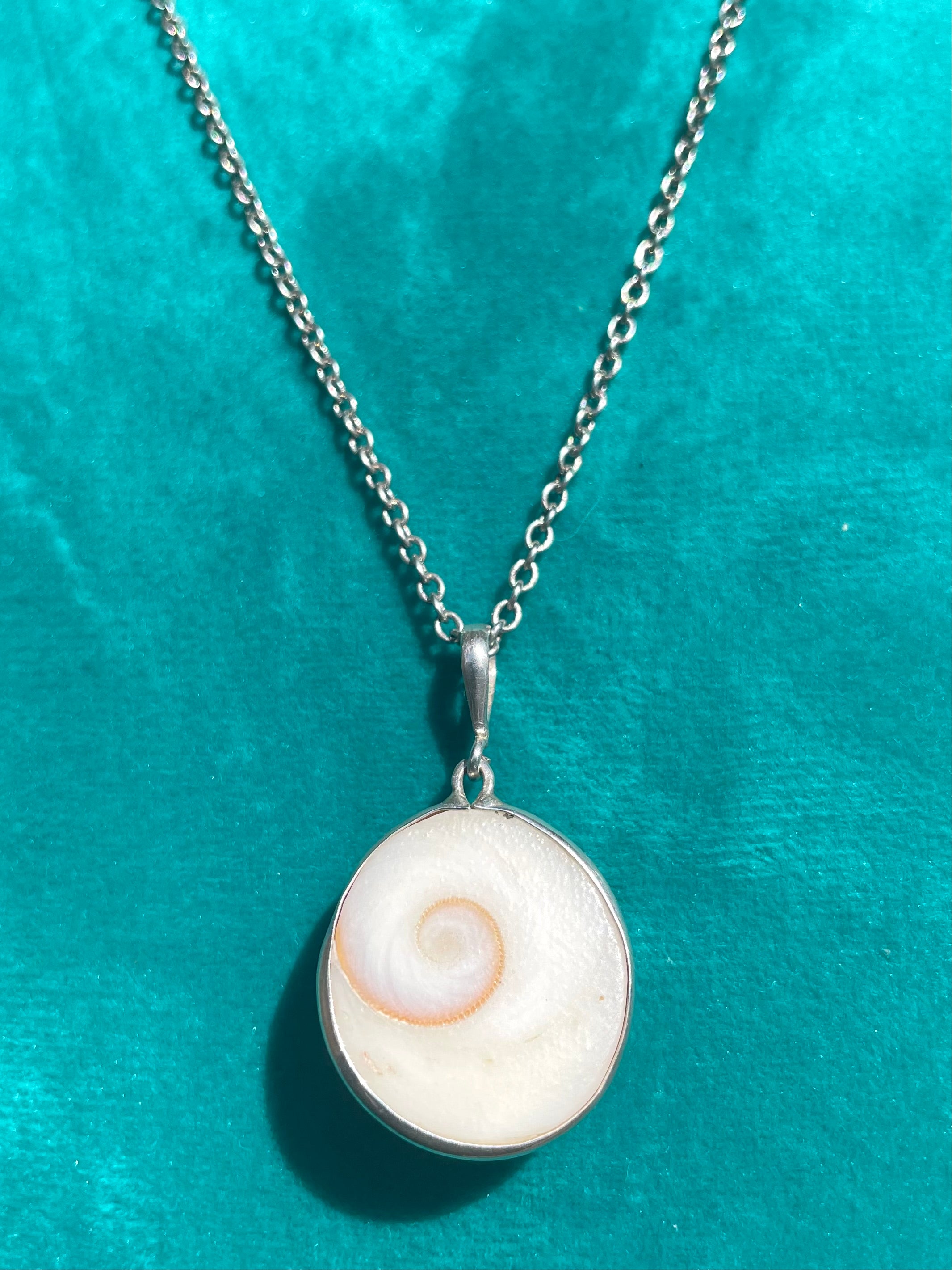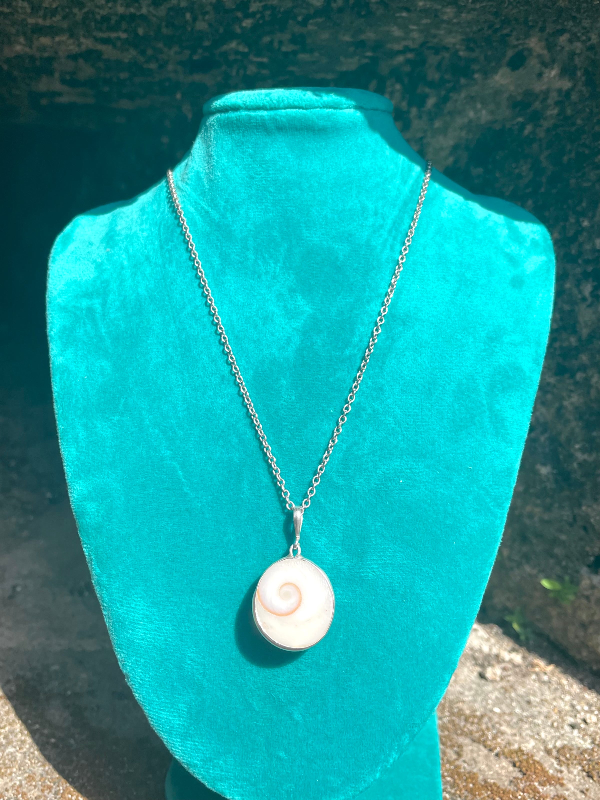 Authentic Sri Lankan spiral shell pendant with silver on a .925 silver chain.