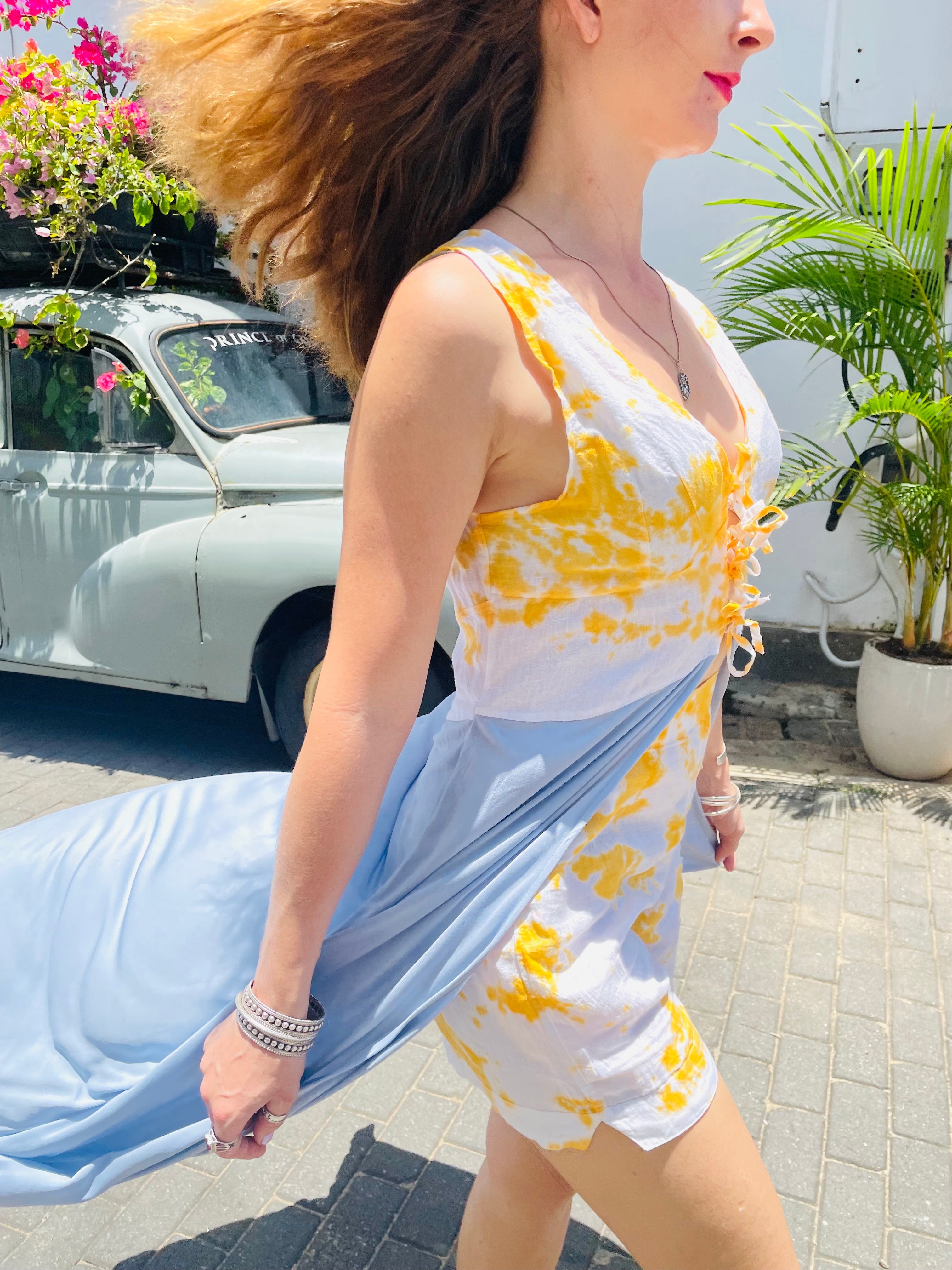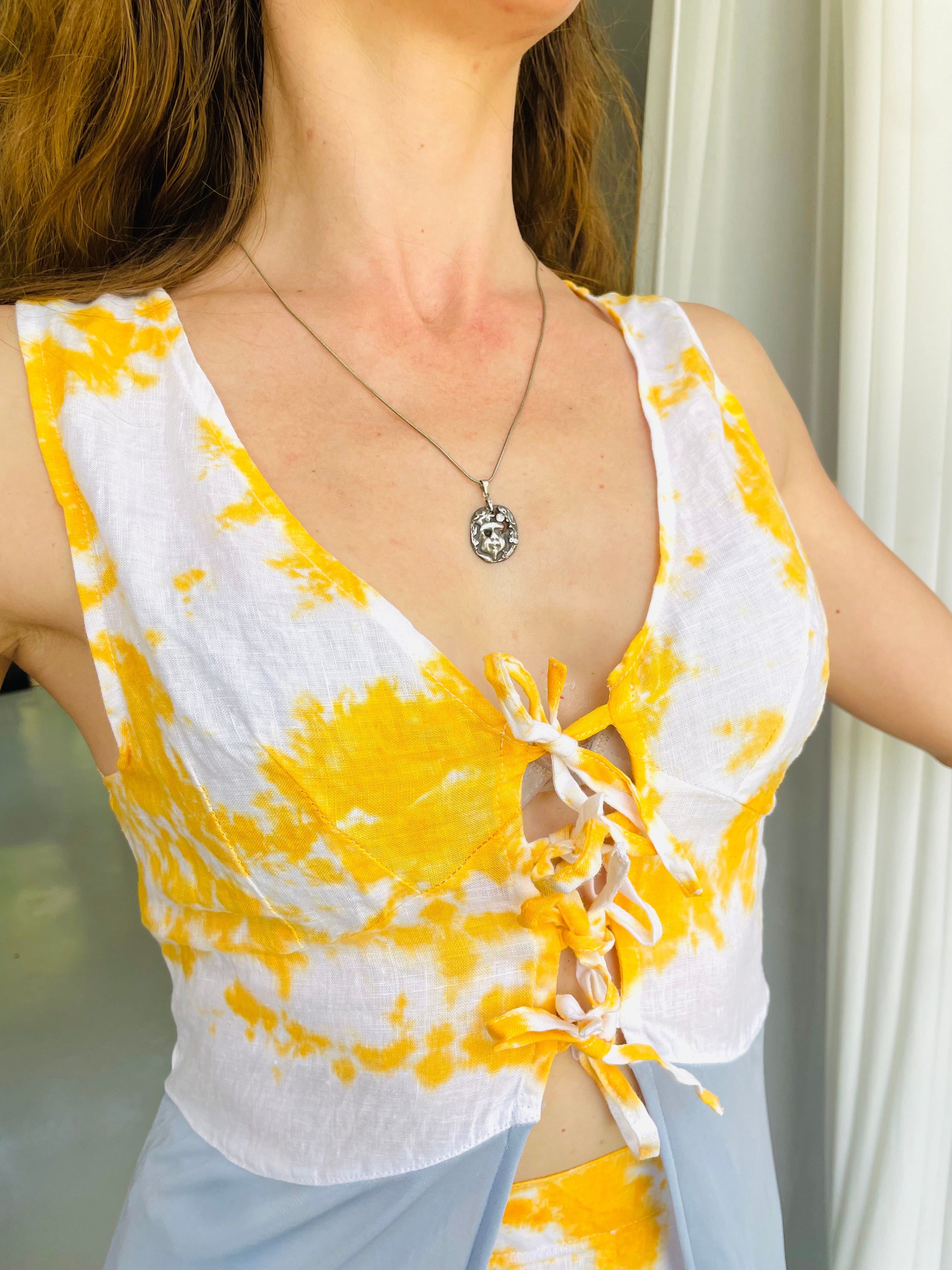 This particular set is made from up-cycled fabrics, cotton and viscose, the cotton is tie-dyed in lemon yellow by artisan Shihani.