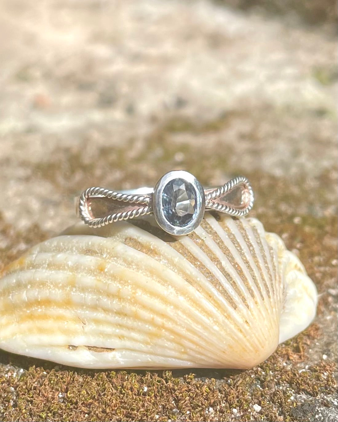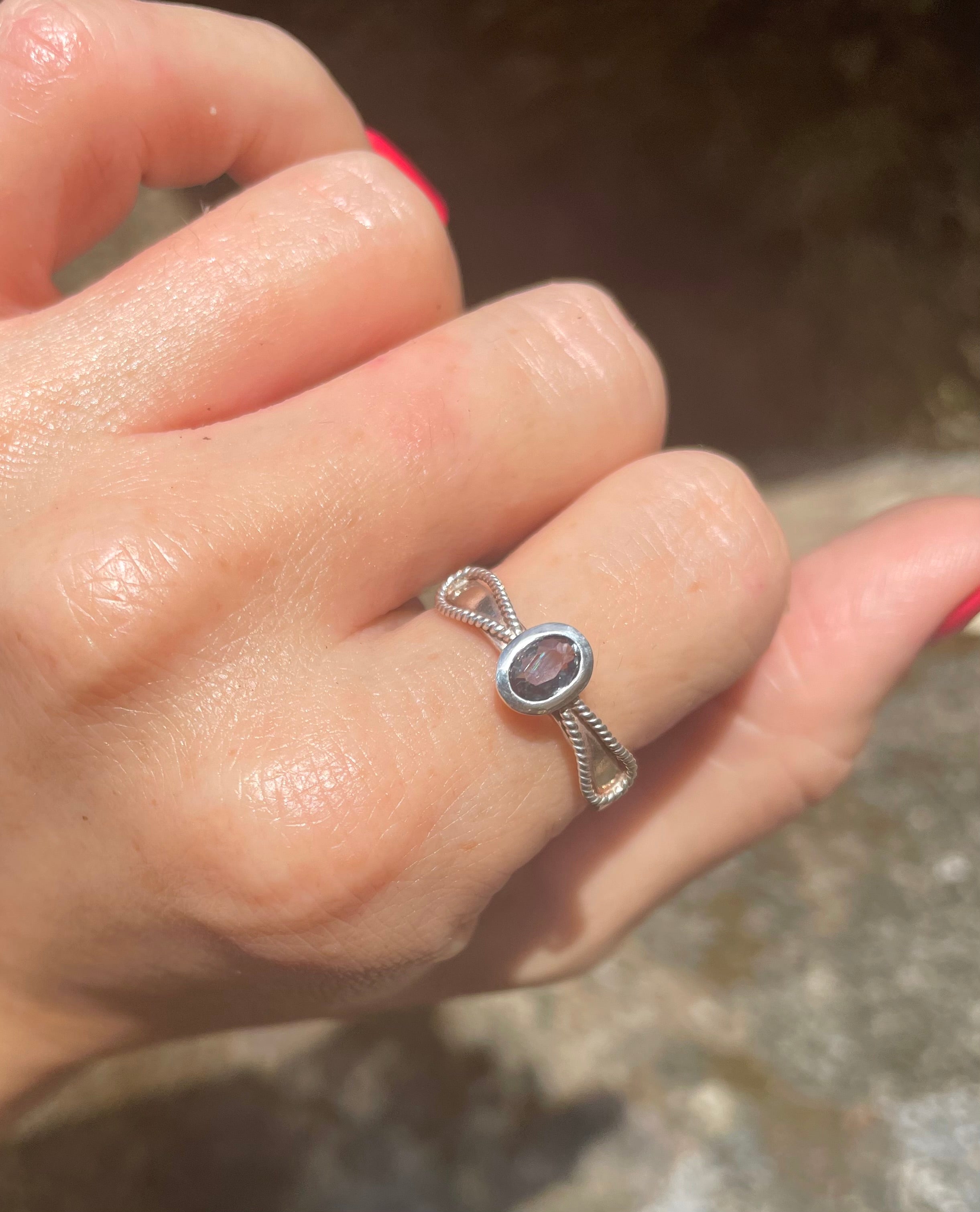 This ring is .925 silver, a thick band, with an oval cut Sri Lankan Sapphire.