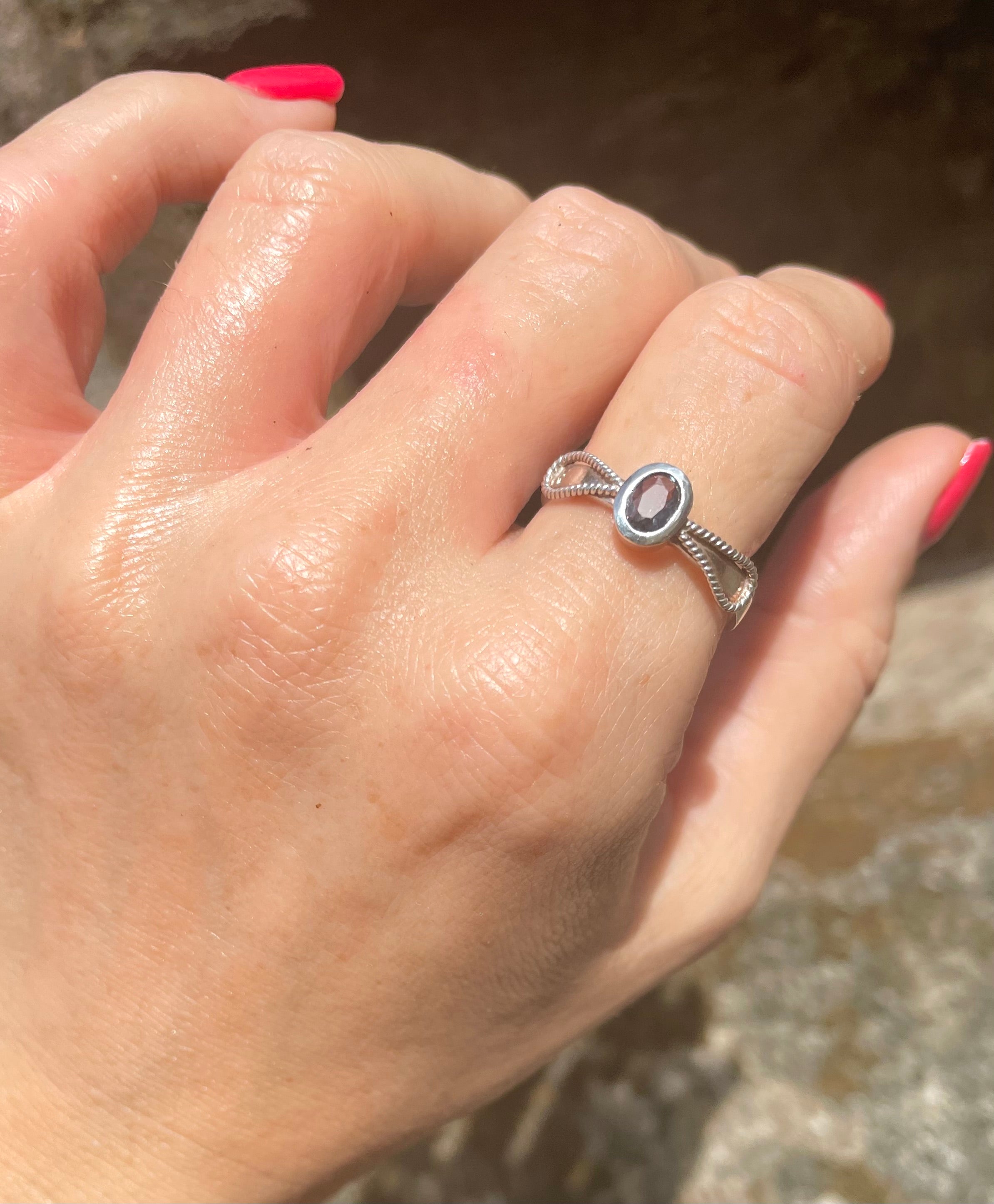 Gorgeous authentic Sri Lankan blue sapphire sparkles on this silver band with an infinity engraved design.