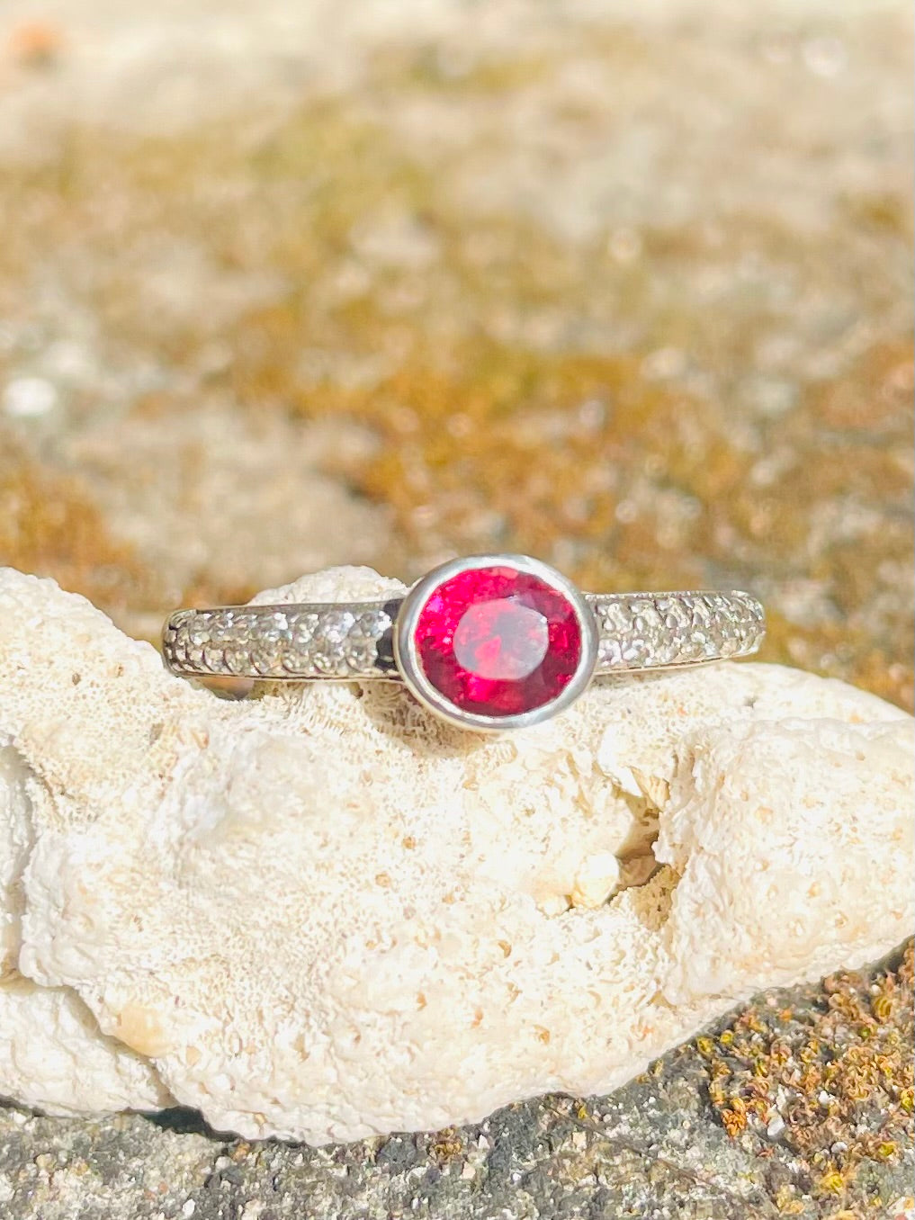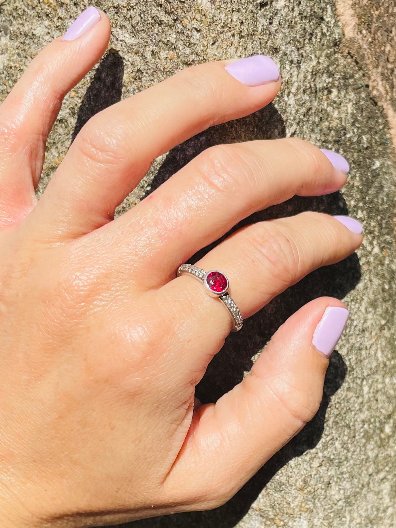 Authentic Sri Lankan burgundy garnet, beautifully cut and surrounded by cz on a .925 sterling silver band.