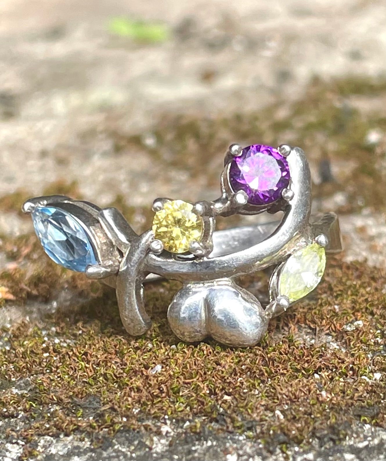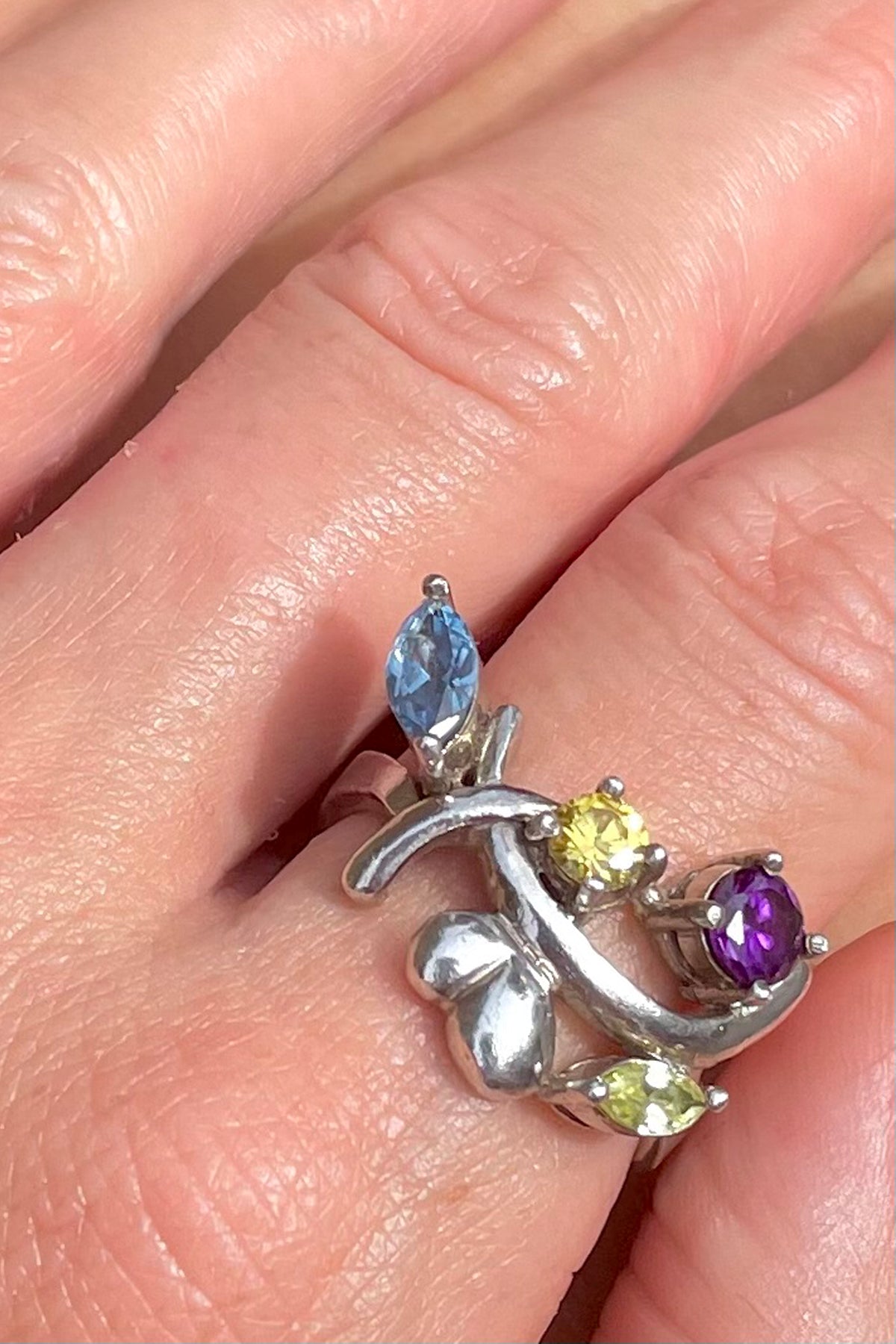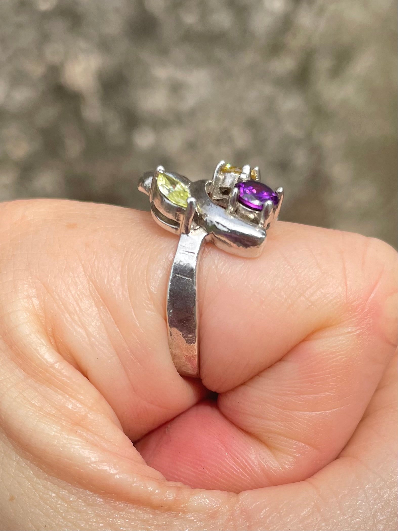 This one of a kind design is stunning and interesting with different cut stones in various colors: yellow sapphire, blue topaz, green tourmaline, and amethyst.