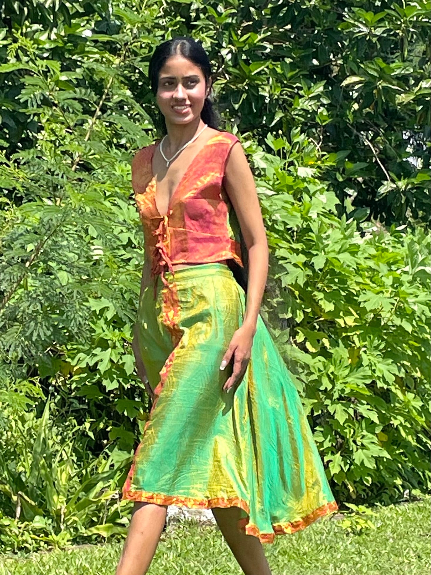 Now, about the set and how it was made. This design was inspired by the fabric itself which was an exquisite vintage shimmering silk saree we sourced here in Galle.