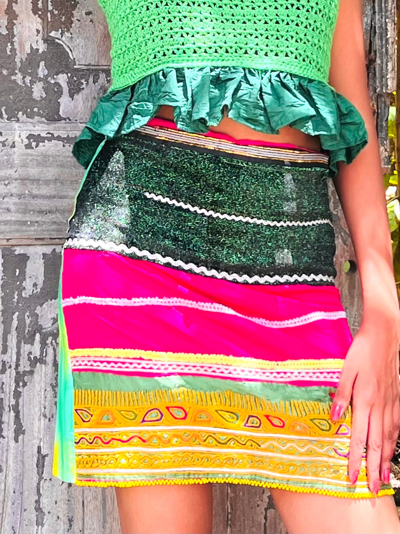 What makes this skirt so unique is the intricate design of inlay and embroidery on the front, while the back is is authentic Sri Lankan tie dye batik done by our local artisan Shihani.