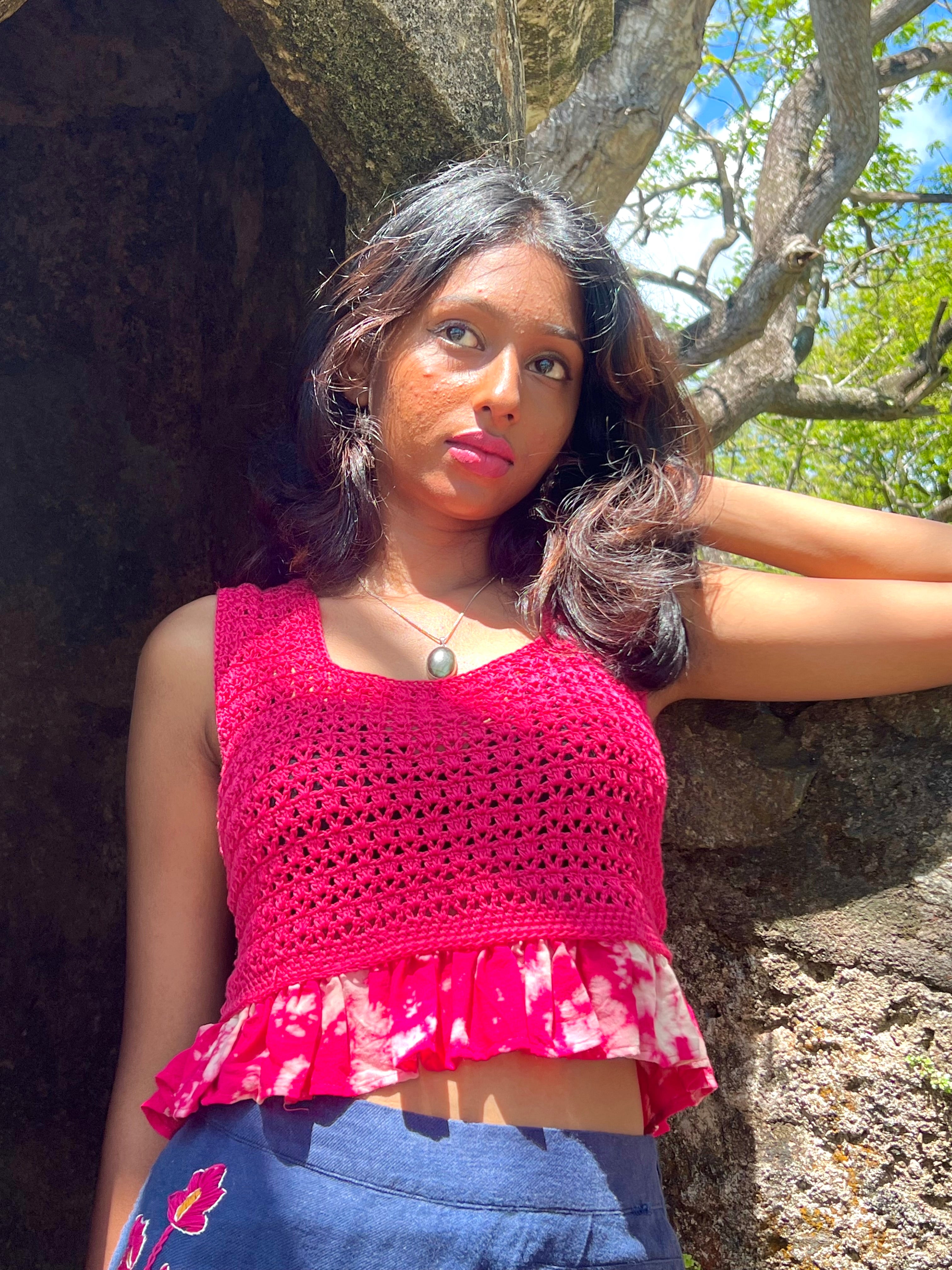 A perfectly lovely top that is both feminine and fun. The top piece is a box cut with a square neckline hand crocheted by our local artisan Iresha. You can read more about Iresha and her work on the artisan’s page. It takes her 3 days to make, the yarn is a recycled blend of fabrics, soft and light. The crochet design makes the top very airy and cool.