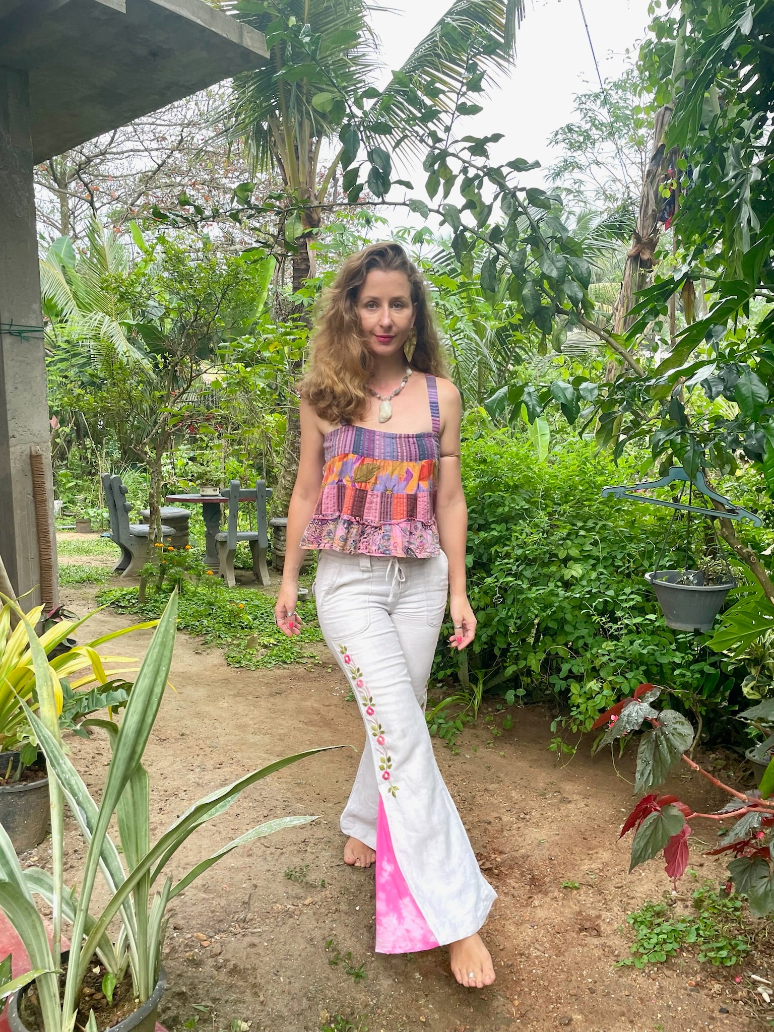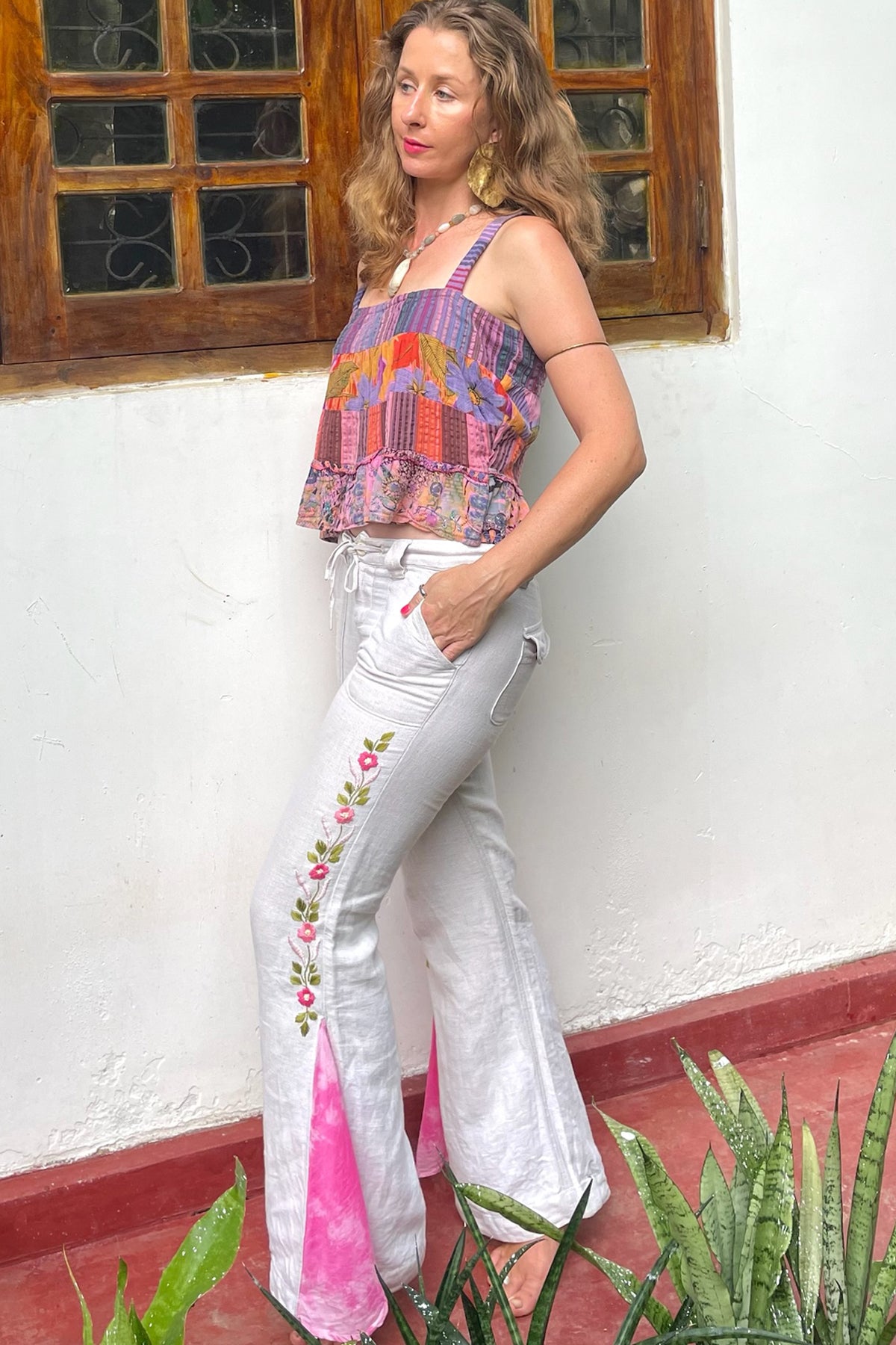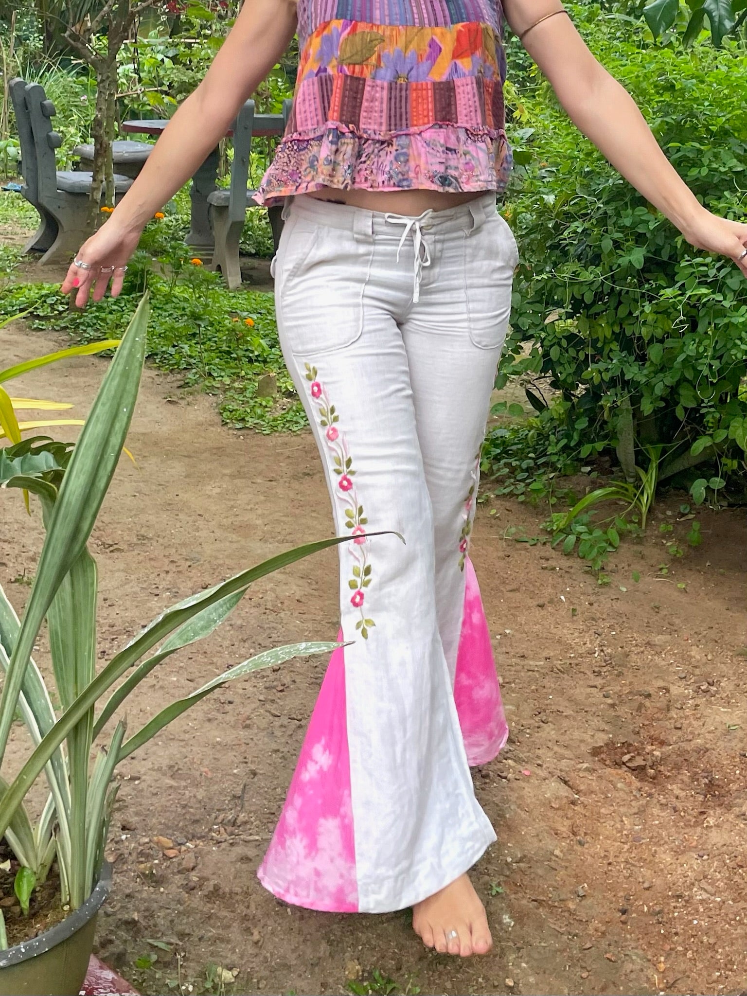 Made from upcycled denim with Sri Lankan tie dye cotton fabric for the flared bottoms. This is an artisanal collaboration. The flared tie dye is made by our artisan Shihani and the gorgeous hand embroidered floral design on the sides is done by our artisan Shakira. You can read more about them on our artisans’ page.