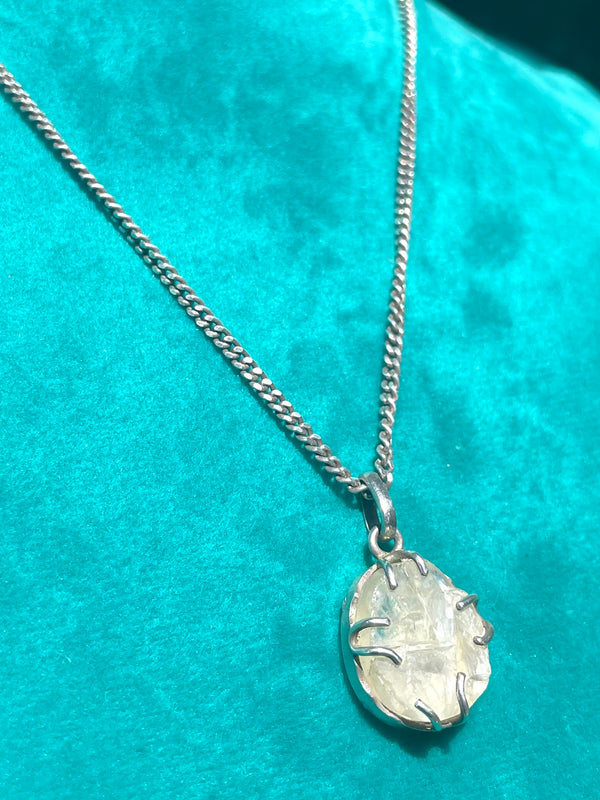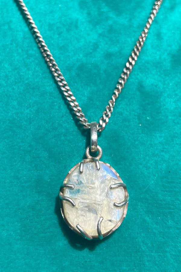 Sri Lankan Raw Moonstone Silver Claw Pendant - Kalumali Design Handmade Pendant made by one of our favorite artisans, Kalumali, who comes from a family making jewelry for generations. He hand picks this stunning, glistening raw moonstone and wire claws the stone in...