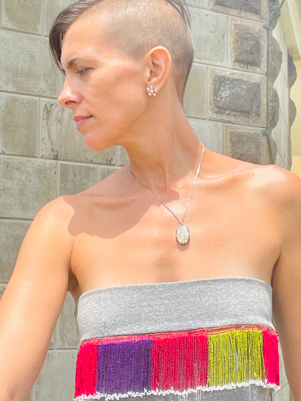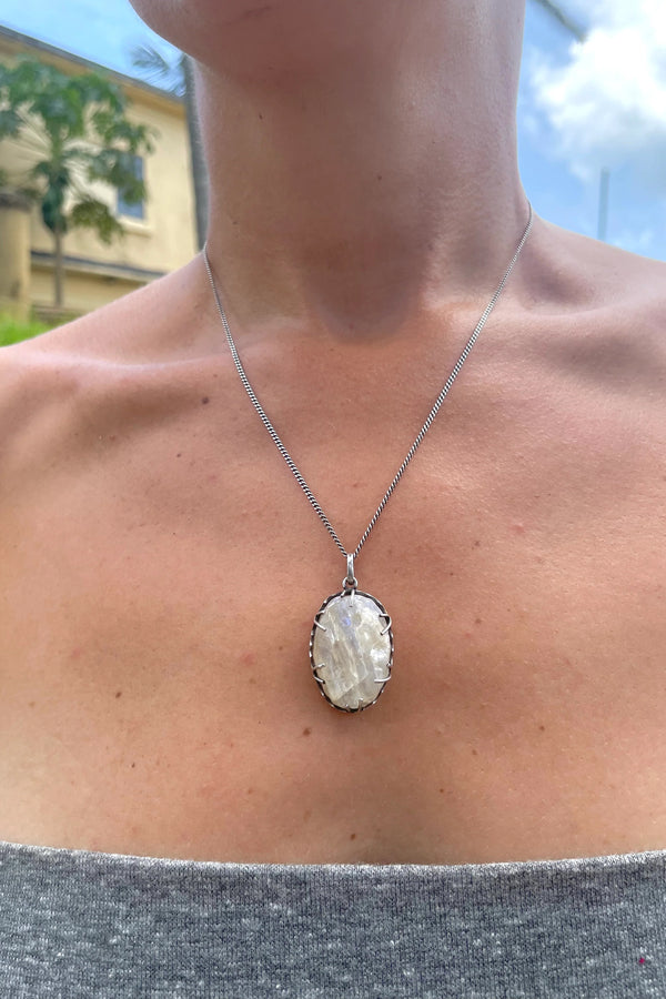Sri Lankan Raw Moonstone & Silver Pendant Necklace Handmade Pendant made by one of our favorite artisans, Kalumali, who comes from a family making jewelry for generations. He hand picks this stunning, glistening raw moonstone and wire claws the stone in .925 silver. The...