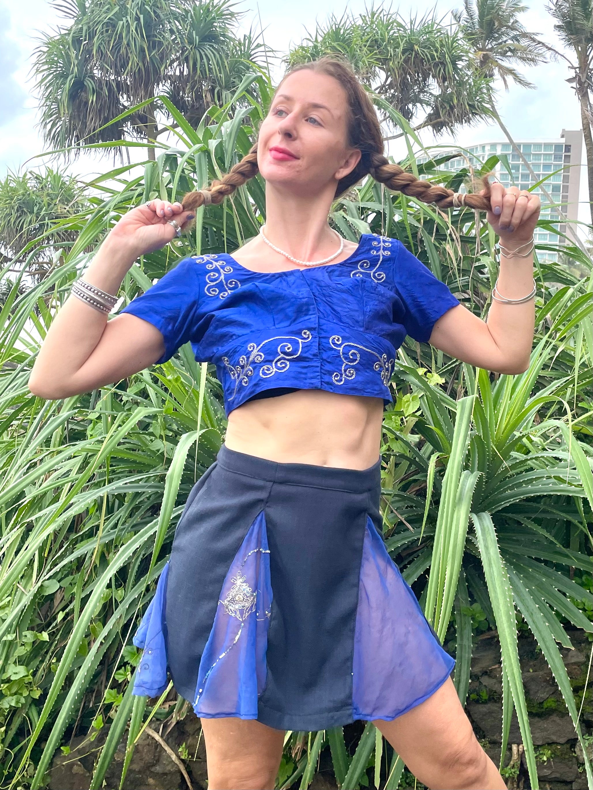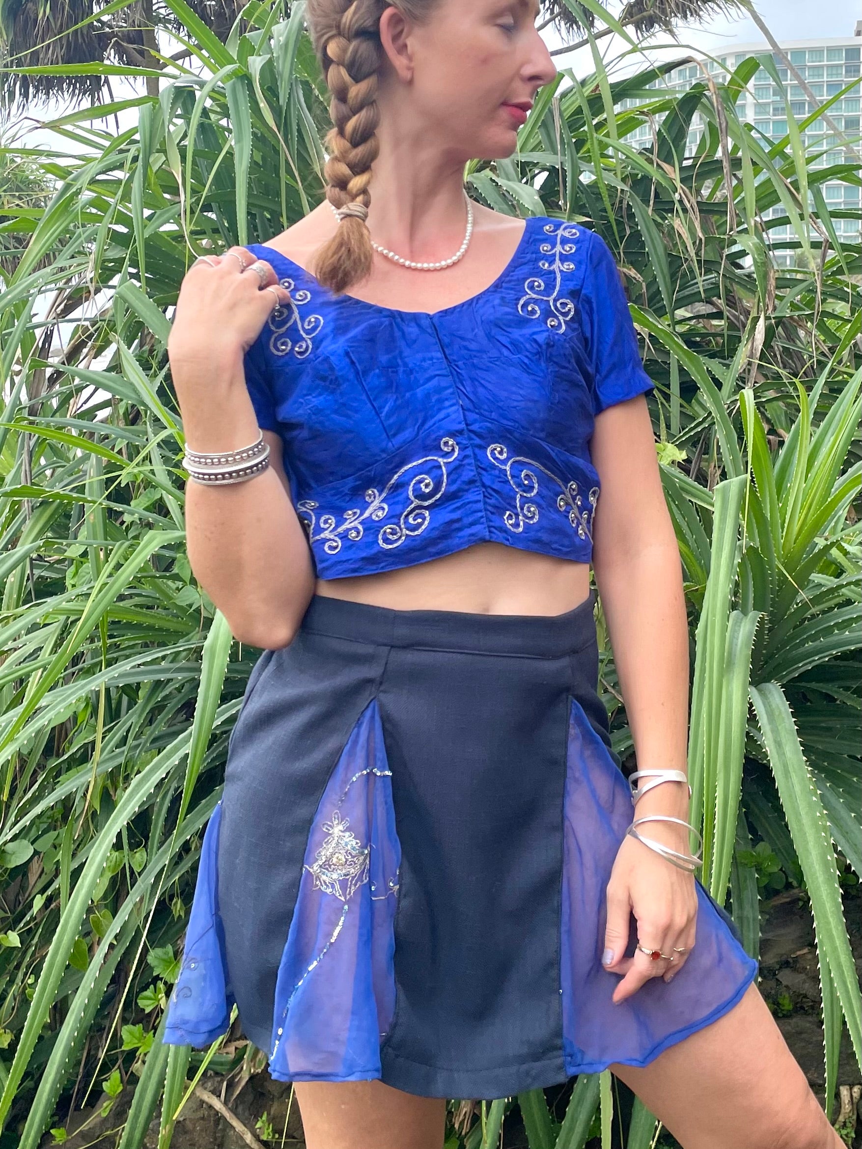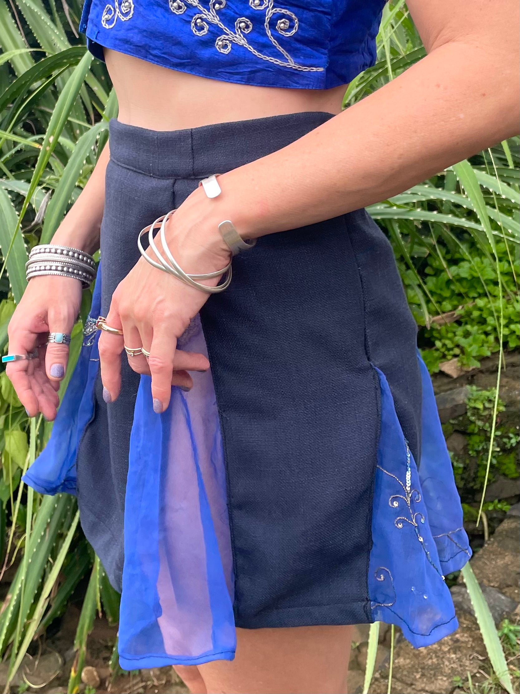 What a fabulous skirt we made; edgy, sexy and smart. The Deliah skirt is an up-cycled creation made from a skirt and a dress. We took the bottom of an elegant discarded dress and the chiffon from a two textured skirt and invented a completely new look in this mini skirt we call the Deliah.