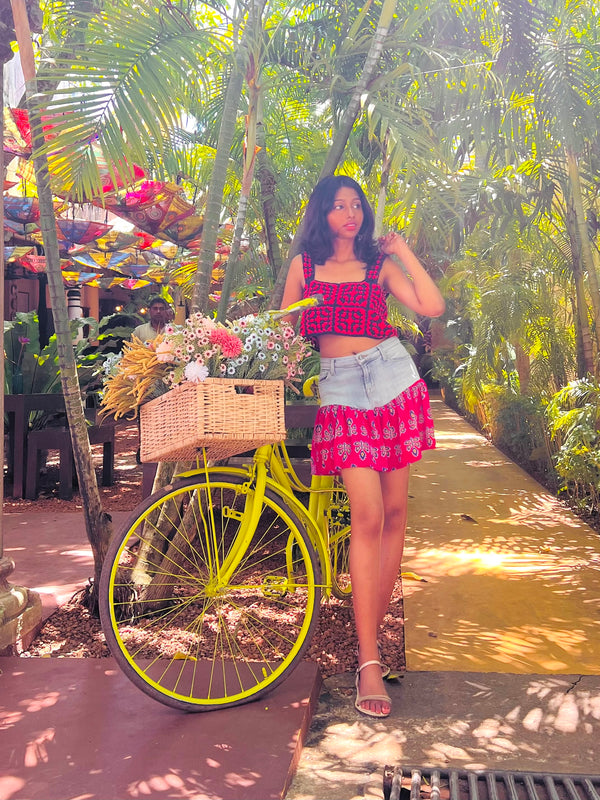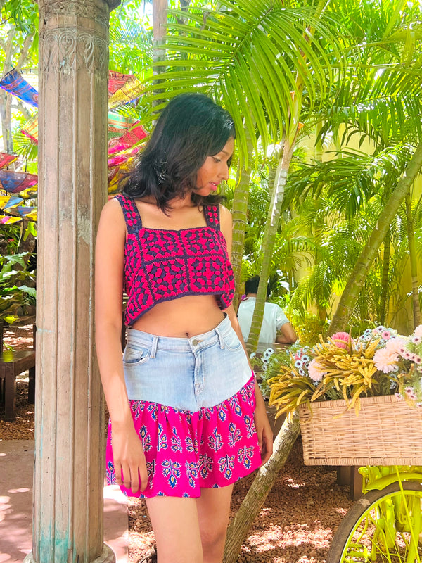 The Ilia Skirt - Lanka Tropicana & Up-Cycled Collection American vintage denim up-cycled to fabulosity with this bamboo/cotton blend fabric of leaf motif. Our new flared skirts are fabulous, can’t love them enough and honestly we can’t keep them long enough,...