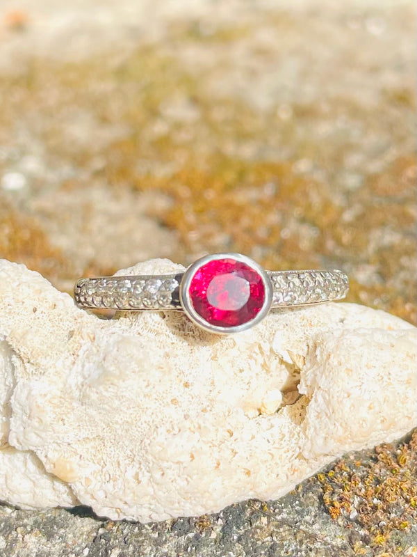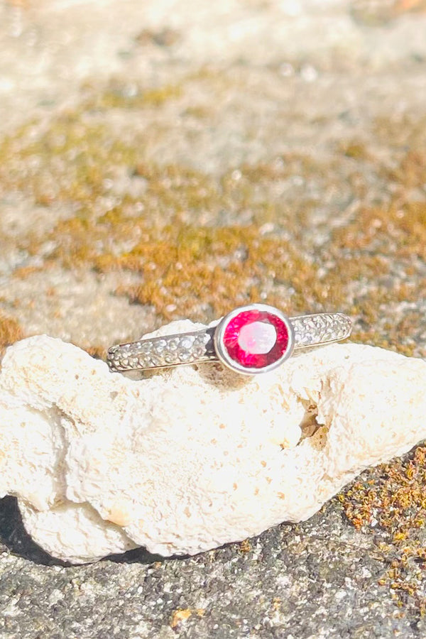 Sri Lankan Garnet & Silver Ring - Designed & Handmade by Kalumali Authentic Sri Lankan burgundy garnet, beautifully cut and surrounded by cz on a .925 sterling silver band. Handmade by our artisan; Sri Lankan jewelery collaborator Kalumali, whom you can...