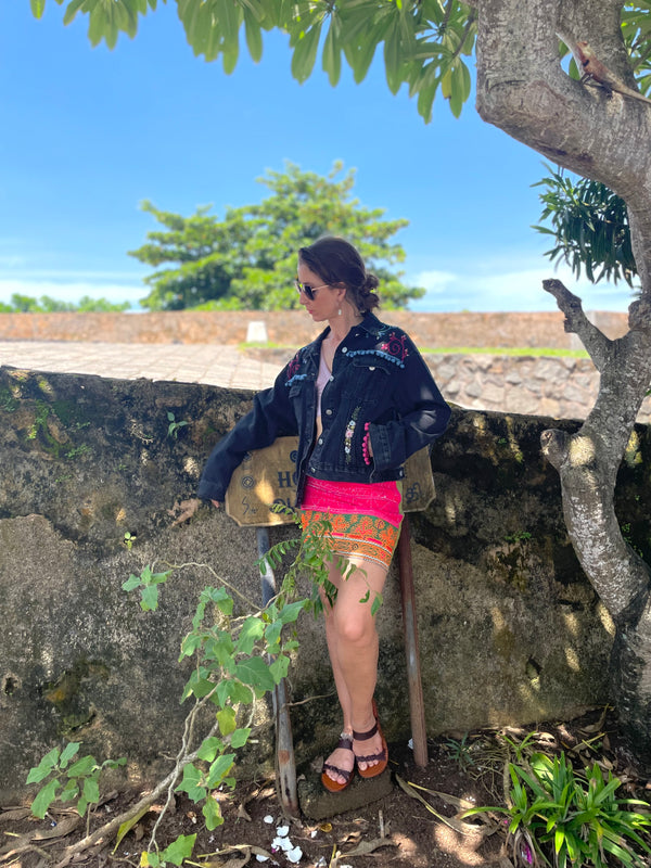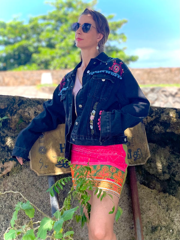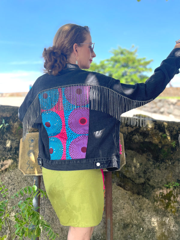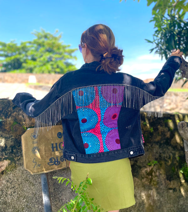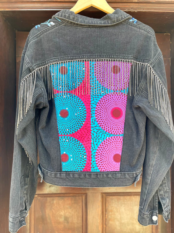 The Roxana - Up-Cycled Denim With Crystal Fringe & African Textile The Moon, a denim jacket brand circa 2000s, in size medium up-cycled to fabulosity with our added touches of sourced vintage and tribal patches. Let me explain a little about the...
